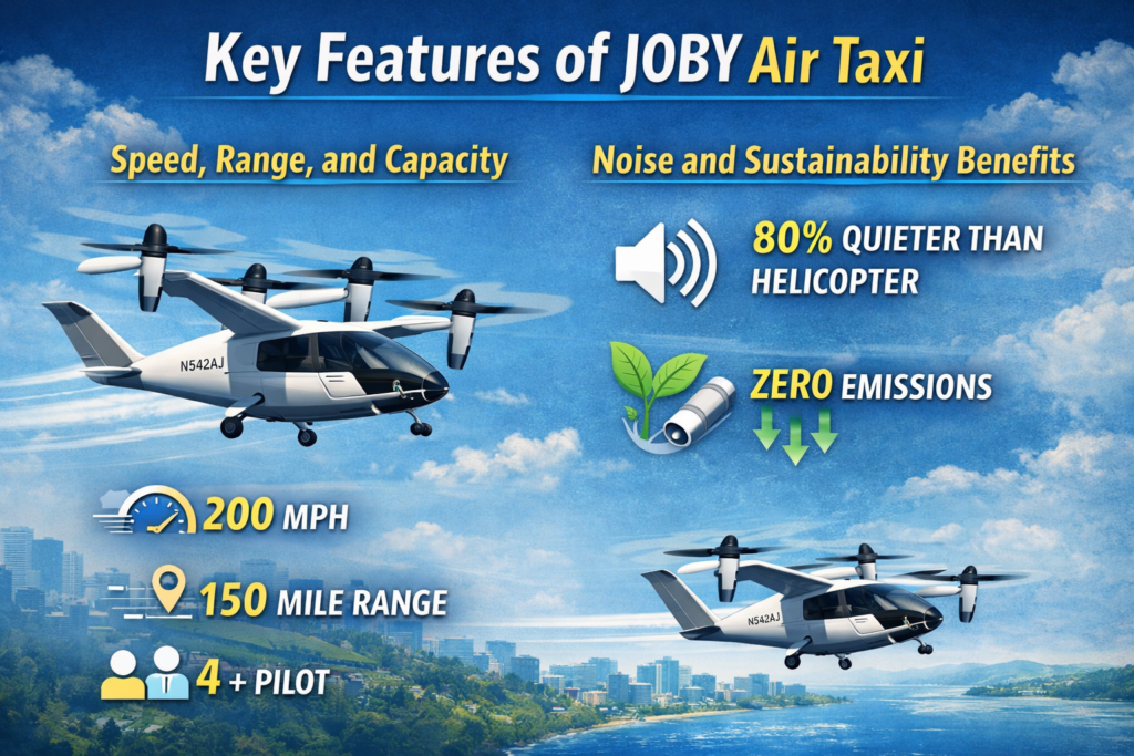 Let’s talk performance. JOBY’s air taxi isn’t just futuristic—it’s fast. With speeds of up to 200 mph and a range of approximately 150 miles, it’s built for both city and regional travel.